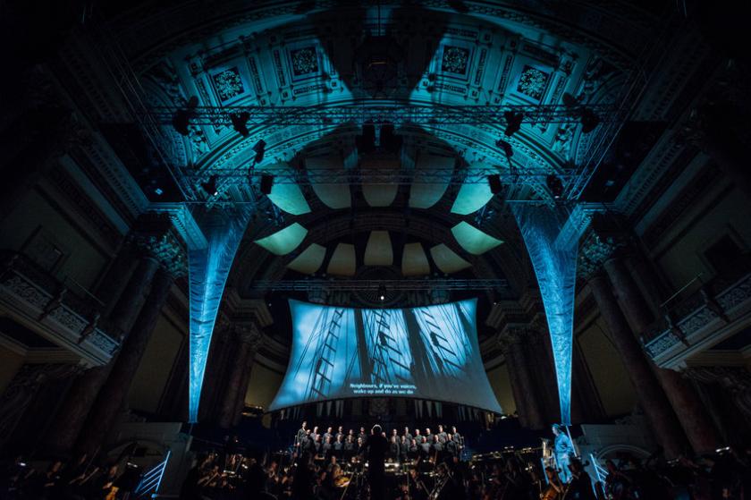 As with The Ring, Peter Mumford’s unfussy direction and video projections make up for the lack of staging. It’s hard to fault the overall effect; rarely do you miss being in an opera house. Wagner’s orchestra (this time rather smaller than the one we’ve become accustomed to) provides more than enough sonic and visual thrills to compensate, and it’s fun to see the on-stage musicians making their appearances. There are some striking visuals: during the overture’s stormier music there’s a swaying ship’s mast which will, if you stare at it for long enough, make you feel as if the whole hall is rocking. The Dutchman’s haunted eyes glare at us. A large screen is fashioned to look like a sail. Fotini Dimou’s elegant costume designs work well, though the Dutchman’s black spangly greatcoat is comically distracting when it first appears.