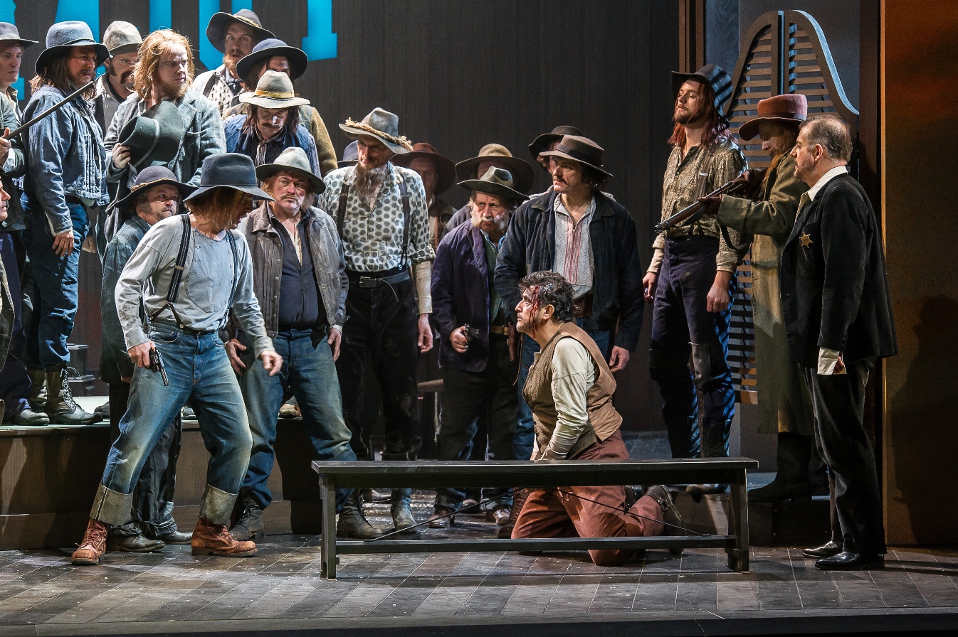 Collins’s last act redeems the evening – a magnificently choreographed, emotionally charged climax. The mens’ preparation for Johnson’s execution (pictured left) is deeply unsettling and you’re ready to believe that it’ll go ahead. Minnie’s dramatic entrance, and her pleading for her lover’s survival is powerfully done, and the pair’s exit is fully deserved. And it’s to Puccini’s credit that the work closes not in a blaze of redemptive sunlight but quietly, thoughtfully. Kathryn Walker’s Wowkle adds a refreshing touch of sweetness in her Act 2 cameo. The production is superbly lit by Andreas Fuchs, and Cadle’s realistic sets look and feel exactly right.