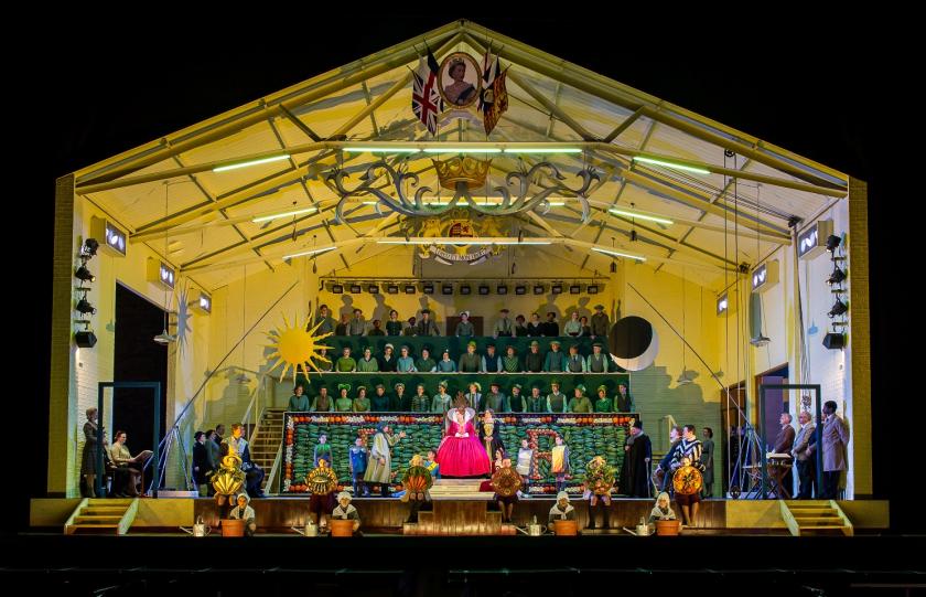 A local mayor takes the young queen to inspect the stage, a horde of little boys hold up word boards to set the scene, and we’re off – with a regal parade from Windsors back to Tudors immaculately choreographed to every bar of Britten’s tournament fanfares, sallies and tattoos. The lights sometimes blind us, as they did in Jones’s parallel Young Vic Ibsen staging. Everyone is perfectly introduced with am-dram gestures writ reassuringly large: the envious Earl of Essex (Toby Spence, back in top voice after a serious illness as the very best and fullest of Britten tenors), his rival for an hour Mountjoy (Mark Stone), supercilious Raleigh (forthright bass Clive Bayley) and good queen Bess whose every word is sycophantically approved by the chorus and who rides off with her reconciled bucks in a floral state coach (pictured above)