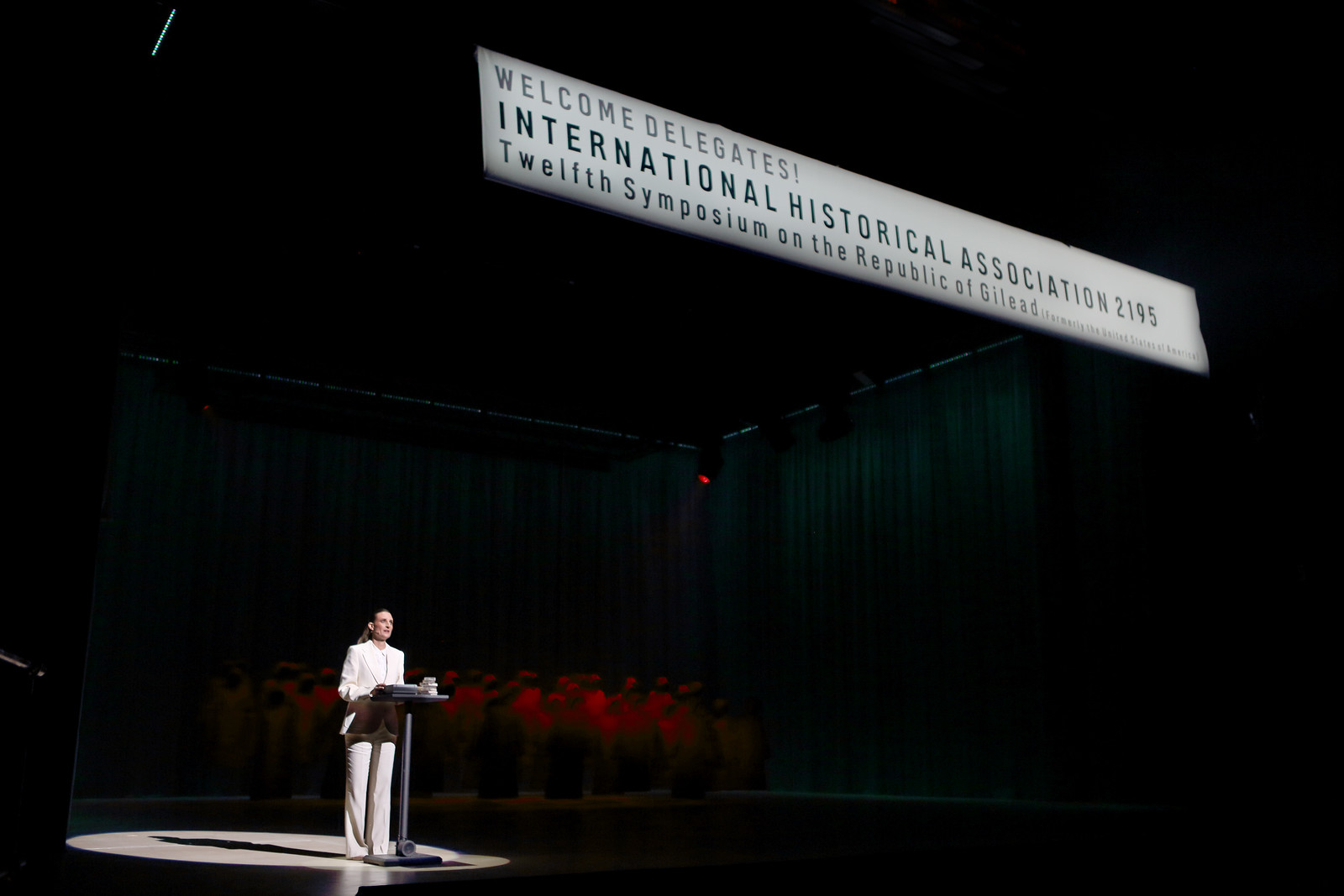 But for its framing device of a conference, centuries after Gilead has fallen – a spoken role carried out by the casting coup of the French actress Camille Cottin (pictured above) – the opera, like the book, is seen through the eyes of the handmaid, Offred. It’s a gigantic role, more than merely challenging, and the American mezzo-soprano Kate Lindsey gives what must be the performance of her life, not only coping with everything Ruders asks of her voice, but embodying Offred’s despair, humility, defiance and the spark of passion that stubbornly refuses to let Gilead extinguish it. Miskimmon has her marching purposefully off stage, only to return, seconds later, walking backwards in slow-motion mirror image with her handmaid colleague Ofglen; sometimes Lindsey’s simple turn of the head or glint of the eye conveys all of her pent-up fury and determination.