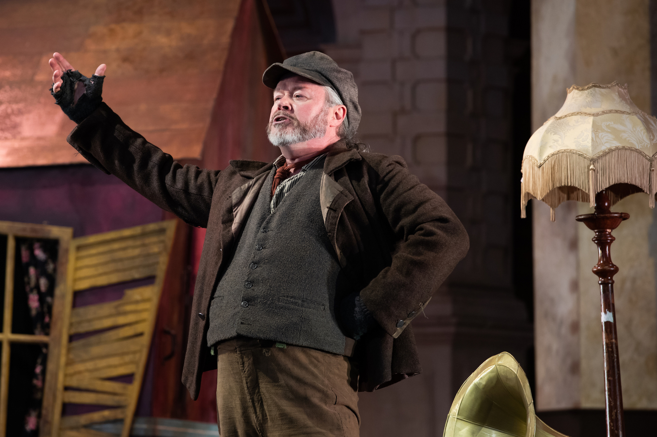 As mischievous, risk-taking brother and sister, Charlotte Badham (Hansel) and Laura Lolita Perešivana (Gretel) found strongly individual vocal styles, tapped into a vein of needling rivalry as well as sibling solidarity, and never sounded remotely twee. Perešivana’s “Little Suzy” song unveiled some rich lyric-soprano colours, and their dance showed off a cabaret-level pizzazz. Then the poignant desperation of Meeta Raval’s Gertrud (pictured above), their mother, arrived to haul us back to the tough reality of fairyland on the breadline. As father Peter, Paul Carey Jones had (literally) got on his bike to flog his brooms. He rode back home with a show-stealing “Ral-la-la-la” song that, with its scorching disdain for the rich, thrust us almost into the Brechtian dramatic territory of a generation later. Carey Jones (pictured below) found terrific charisma in the role, his sonorous bass-baritone joviality inflected with a rasp of underlying anger as he insisted that “Hunger is a raging beast”. We grasped that, in this wood, it’s empty purses that will ultimately devour body and soul alike.