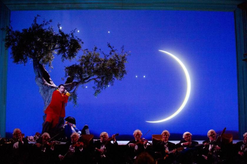 We open with one the opera’s lovelier tableaux – the sole scene to escape from the boxed interior that so oppressively frames the rest of the action. Deep-blue midnight turns to psychedelic morning as the lovesick Count Almaviva serenades his deeply slumbering Rosina together with 25 of his closest friends. Playing wittily with the set’s split levels, this is genuinely charming stuff, and the male chorus, with their periwigs and a symphony orchestra of different instruments (later to return for an equally splendid chorus cameo as white-gloved Gilbert and Sullivan-style policemen), are a delight.
