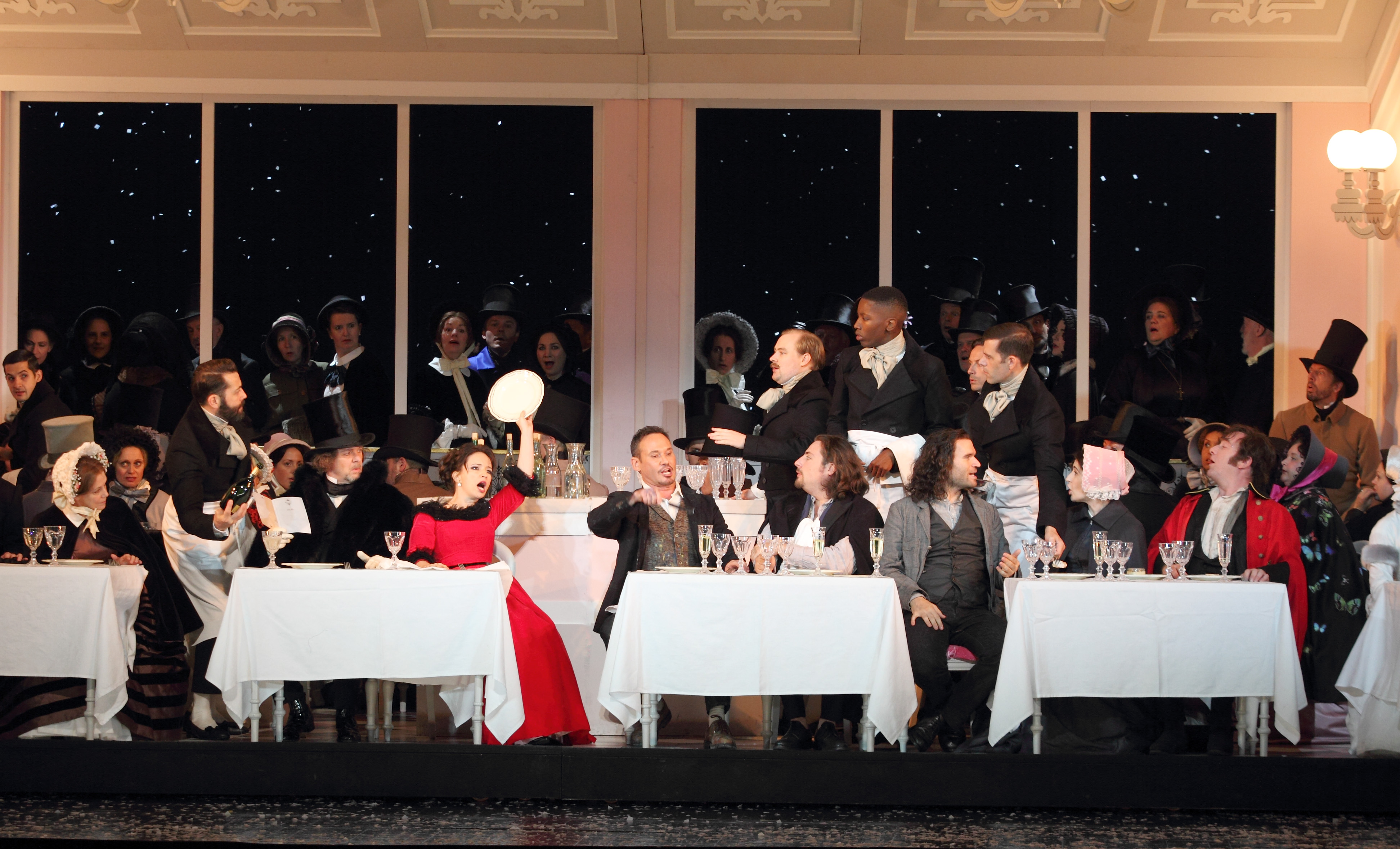 Maybe more rehearsal time would have helped, or perhaps the opera’s special version of realism is simply at odds with any kind of Jonesian stylisation. Certainly the scene where the Bohemians gather at the Café Momus on Christmas Eve (pictured above with Simona Mihai's Musetta in red) has his trademark straight lines, usually enjoying a special turn of the screw with each new production; so far, at least, this doesn’t quite work. Admirable, at least, to have so much downstage and delivered out front – I suspect the essentials can be clearly seen wherever you happen to be sitting in the Opera House.