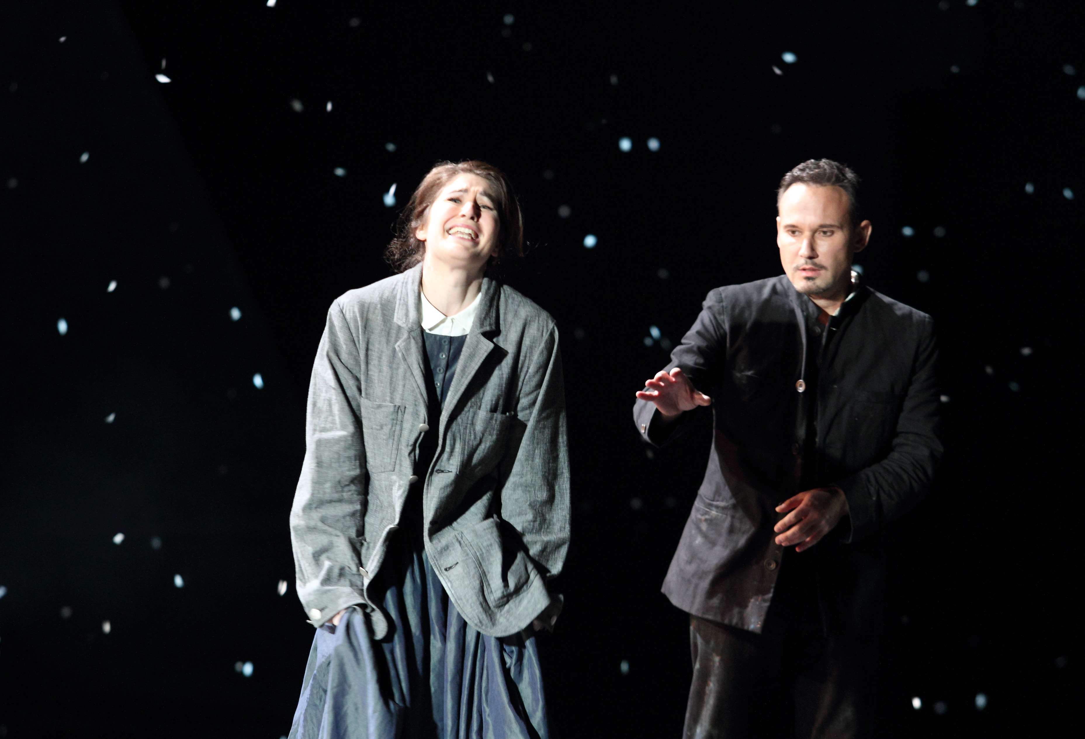 Jones’s design team of Stewart Laing (sets and costumes) and Mimi Jordan Sherin (lighting) also delivers on something for Royal Opera regulars to coo over in its three illusionist shopping arcades, eventually yielding, not quite seamlessly, to the interior of the café itself. The rest offers subtle twists on what you might expect – a low-beamed attic (7b, for some reason) with corners for the lovesick Rodolfo and Marcello to hide their emotions in, a bare stage with a cabin tavern at the customs post for Act Three (though seemingly on the roof, since the outside of 7b is there at the back). And lots of snow, with convincing simulation from the principals of feeling "devilish cold" ("freddo cane"), though no moonlight and no candle-snuffed-out darkness for the start of Mimì’s and Rodolfo’s getting-to-know-you. The end of winter which will signal their ultimate parting casts a cruel green light on the two final chords of Act Three, and the attic has a brighter sun shining in, bad timing for consumptive Mimì’s demise.