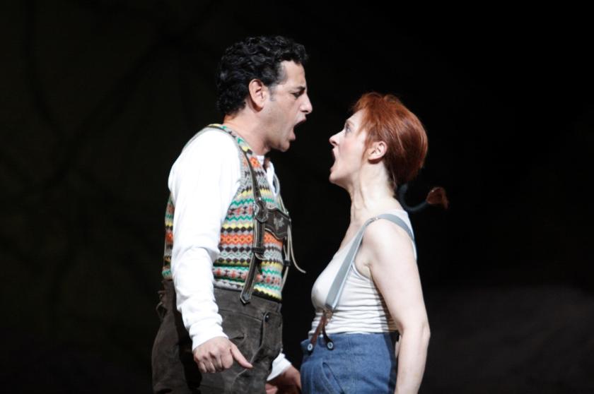 There's little variety in his arias discs, and it’s not a voice I find I can listen to for long, but then in La Fille du régiment one doesn’t have to. Around him a male chorus produces variable quality – near-inaudible in the Act One “Rataplan” chorus – and ham acting, not much helped by the am-dram routines, a bit of a surprise from choreographer Laura Scozzi now that I’ve seen her unique take on Rameau’s Les Indes galantes, but then she’s not working with dancers here.