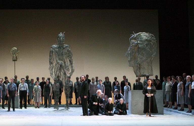 This suggestive setting provides atmosphere, but is no substitute for the action and dramaturgy required. When Nabucco (Amartuvshin Enkhbat) makes his entrance in the first act, Verdi gives him grand and lengthy processional music. But here he just walks on in a drab suit, and then has to shuffle around mid-stage waiting for the music to end. The chorus is choreographed more effectively, although the drab costumes make it difficult to distinguish Jews from Assyrians, and the sophisticated crowd movement highlights the more primitive Personenregie of the principals. The setting changes for the second half, as we move from Jerusalem to Babylon. The temple setting there is dominated by the idol of Baal, which takes the form of a huge figure in metal gauze, brought on in procession and assembled onstage. Again, the simple stage furniture complements the more sophisticated chorus movements.