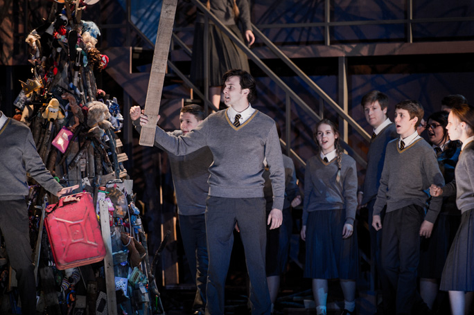 This is one of many areas where the libretto plays safer than the novel; Teller makes the "sacrifice" the much more horrifying one of the other kids digging up the coffin of Ursula's young brother to add to the pile (an old dog guarding its master's grave gets involved in the ritual too). Oddly Maxwell prefers to stick to stereotypes – all the boys at first choose superheros and action-men models to throw on the "pile of meaning", the girls select girly things – whereas Teller extends the participants to include an effeminate boy and a Muslim who gets beaten black and blue at home for having to hand over his prayer mat. This part of Sussex, needless to say, is less multi-culti than provincial Denmark, so the representation on stage is also less mixed, to put it mildly.