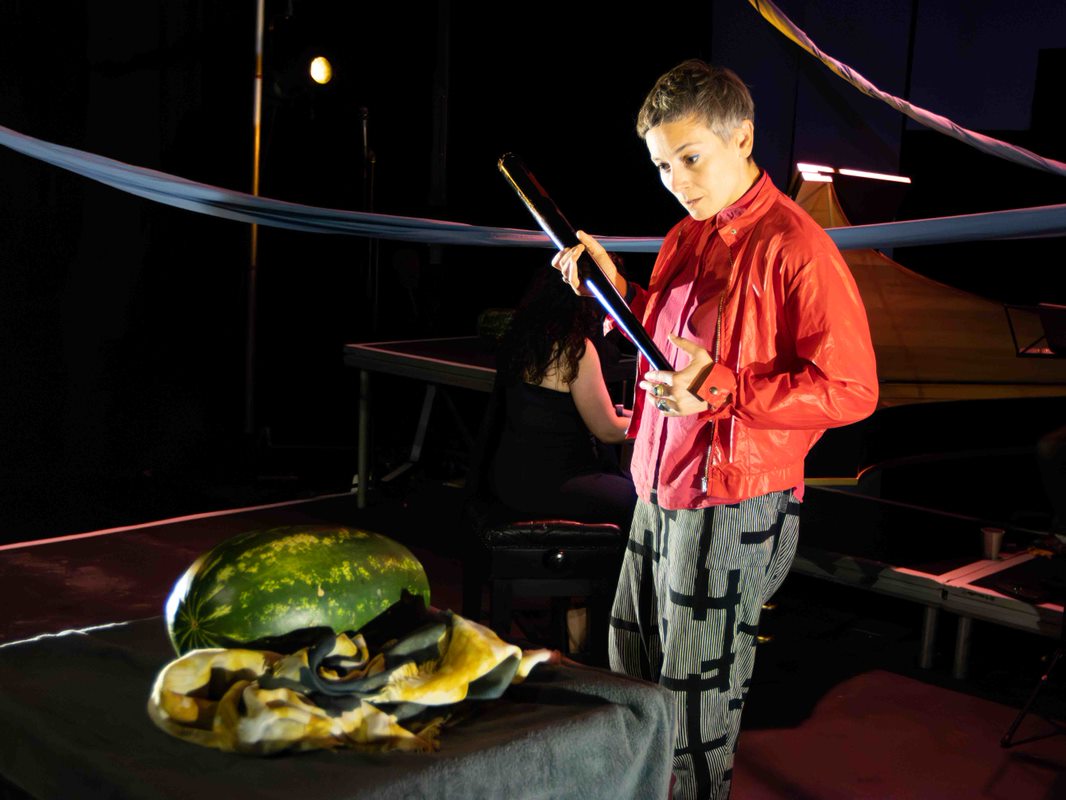 There’s much use made of watermelons as props. I think they serve as a metaphor for flesh, though to be honest their purpose was sometimes lost on me. Still, it’s good to see the cast getting their five a day, and watching Anna Dennis (pictured above) and Carolyn Sampson smash a watermelon to bits with a baseball bat will never be anything but entertaining, even for the front-row audience members who were splashed in the face. (For those concerned, a plastic sheet was held up to protect the period instruments.)