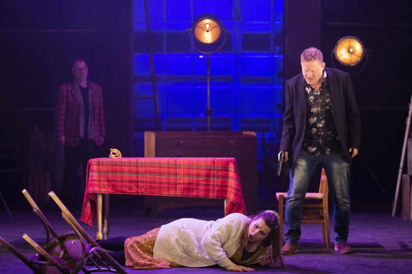 Of the other characters, Tonio is for me the most problematical. His prologue is one of the score’s most beautiful stretches, but his philosophy doesn’t survive curtain-up (when there’s a curtain), after which he becomes a seducer and a sneak. It’s hard to get all this right, but Robert Hayward, whom I last heard singing another highly ambivalent character, Musorgsky’s Ivan Khovansky at WNO, has the voice for it (despite a not quite trustworthy vibrato) and a strong, vivid presence (pictured below). Silvio, Nedda’s lover, is a less colourful personage, certainly a safer bet, but with not much chance to develop beyond the image of her yearning for a settled life. Nicholas Lester did what could be done with the part, singing immaculately in their Act 1 duet, and blowing her a (distant) kiss at the end of it - quite enough to enrage the already jealous Canio, no hugging required. The fifth character, Beppe, is more than just a walk-on, and Aled Hall played it just right, struggling to keep the peace, and adding a nice serenade at the start of the play, complete with non-existent guitar.