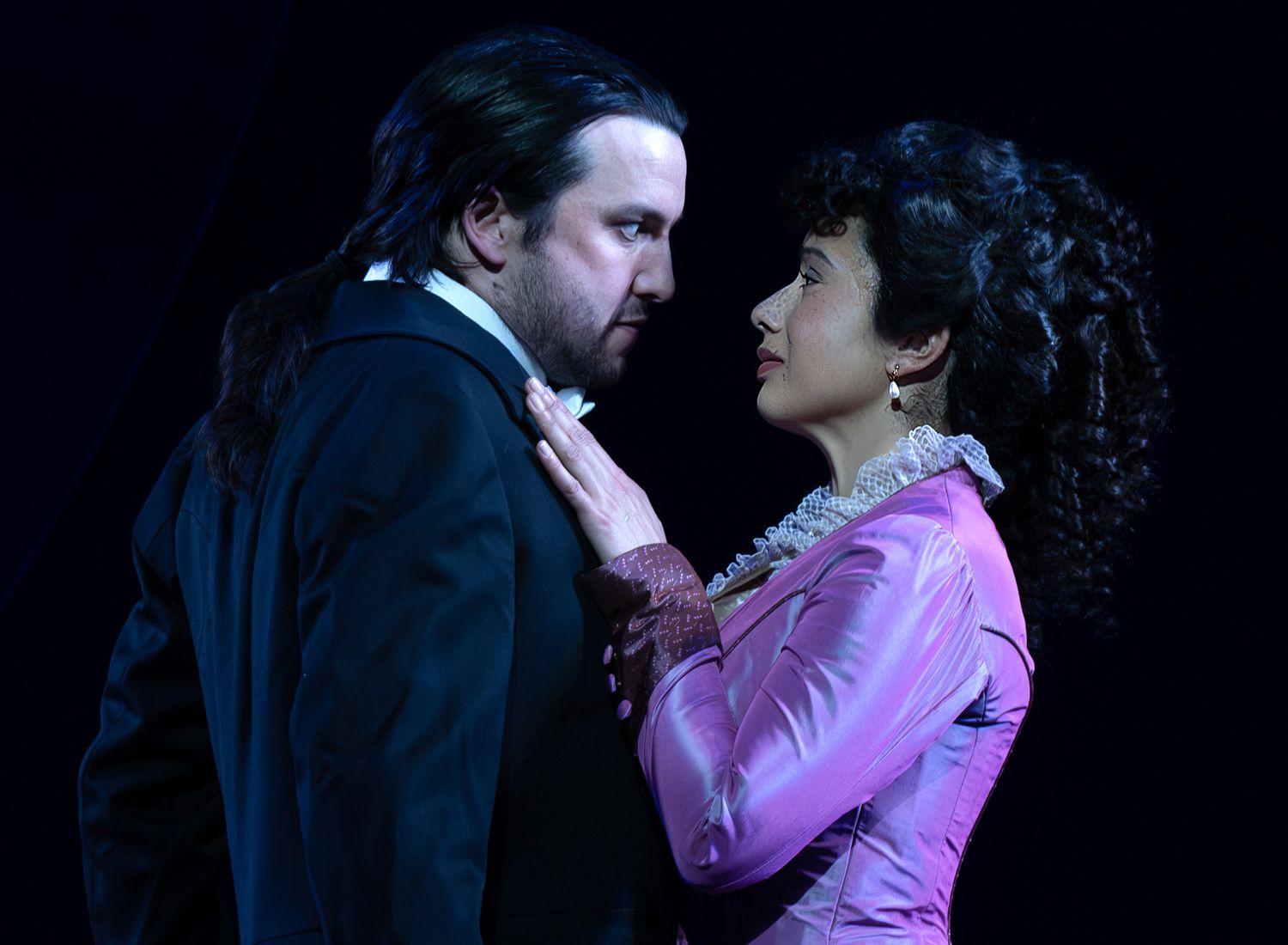 Fusion between pit and singers often attains perfection. William Morgan (pictured below with Isabelle Peters) as Frederic, the "slave of duty" of the operetta's subtitle who will serve out his piratical indenture to the age of 21 even though (spoiler notice) as a leap-year baby he won't attain that birthday until 1940, sets the energetic tone right at the start - the dialogue zings - but also phrases beautifully. "Oh is there not one maiden breast," the appeal to any girl among Major-General Stanley's entire chorus of daughters to rescue him morally, makes beautiful musical as well as verbal sense; the alliance with Murray Beale is surely part of that. And her delicate handling of strings in the old-fashioned tune for the Sergeant of Police's famous song complements James Cresswell's resonant but deadpan delivery; less is certainly more here.