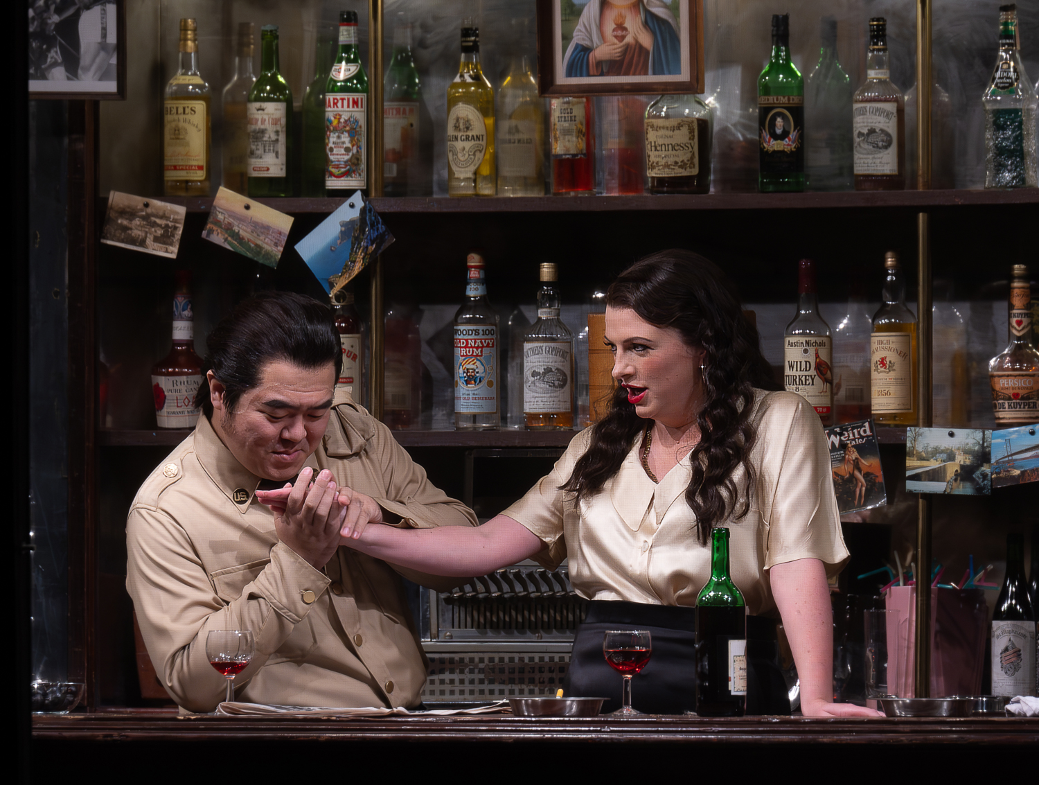 In the opening party tableau, and later, the chorus move with a purpose; there’s little aimless milling. We sense the allure both of this wood-and-chrome Manhattan sophistication, and of the brute force barely concealed behind it: “made men” play Mad Men. The onstage band integrate well – complete with obligatory visual gag about machine guns in violin cases – as, behind the bar, Weston Hurt’s white-jacketed Rigoletto (pictured below) imposes a wisecracking authority despite his withered arm (rather than hunched back). As the Duke, Yongzhao Yu gave a wheedling, petulant quality to the casual misogyny of “Questa o quella”: consistent with his seedy characterisation here, but unlikely to satisfy those who crave a more plausible seducer in the part.