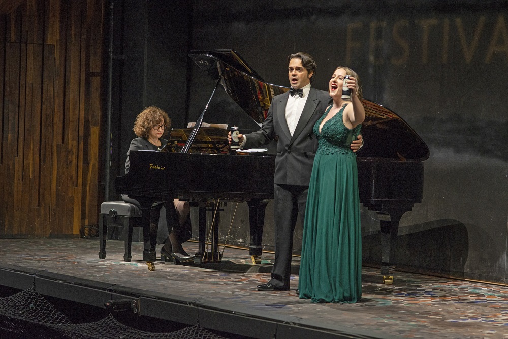Phoenix’s part in the joint recital was well interwoven with contributions from an Italian tenor with a baritonal timbre, Leonardo Caimi, who won several points for singing the top B flat in Bizet's Flower Song piano; both were appearing in La Ciociara. Exits and entrances might have been more professionally managed, but youthful charm carried a happy hour with the guiding care of music director and repetiteur Carmen Santoro (pictured above with Caimi and Phoenix raising cans in the Brindisi from Verdi's La traviata)..