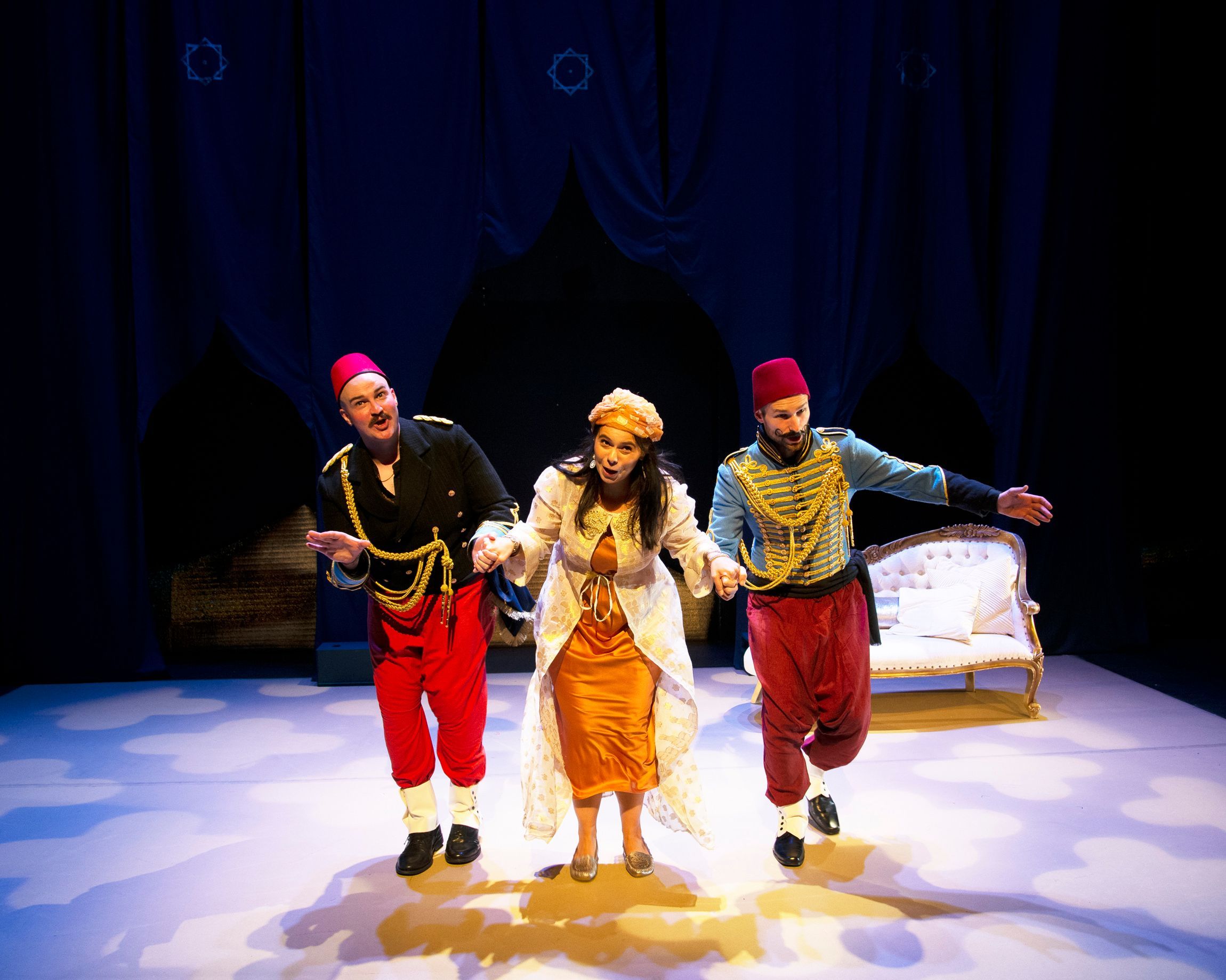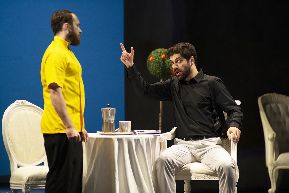 We were in the lobby of a hotel run by mafioso Mustafà; Manoshvili (picture above right with Peter Lidbetter as Haly) is far too handsome to be a constantly comical mug mocked by yachtwrecked Italian girl Isabella (Anna Helena MacLachlan), but his macho posturing gives cause enough for mockery. And yes, this is the agile genuine bass the role needs. Complementary comedy was returned especially by William Kyle’s cicisbeo/mock uncle Taddeo and Ami Hewitt’s discarded mistress Elvira. And at the end of the show, there was sunshine without, on the estuary, to match so much solar power accumulated in these wonderful fringe comedies. What an achievement, and the immaculate, jam-packed programme book continues to inform and delight.