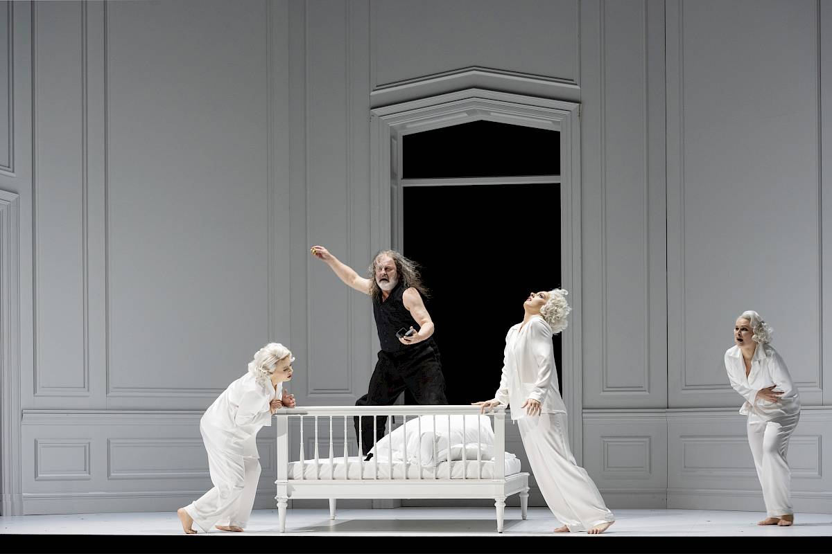 “You also have another layer which is before the gods, something eternal, which is also in the Germanic mythology, so we thought about what that is, the beginning – is it nature, this concept that everything happens in the Rhine, below water level, what does that imply? The way people move around – fast, flexible Rhinemaidens and someone trying to interact with them but having the handicap of not able to move as well as they can. You have to create that with your direction, or the fun is not there. The scene has to be entertaining. This is what you have to achieve in terms of the physicality. But then you also have the metaphor – the Rhine, what does that mean? It is already a metaphor for unspoilt nature, and if you listen to what Wagner composes, it ends up feeling like floating water, but at the start it’s not – it’s pre-time. So we created a space which creates the feeling of being beyond time; we’re trying to find something surreal which comes from our minds, it’s enough to say that it’s something like the beginning of our consciousness, in a space which is maybe like in heaven, with ideas of pure, maybe a little bit aristocratic, architecture, beyond our normal life, three spaces on a revolve, all identical. There’s nobody there, it’s waiting for things to happen.”