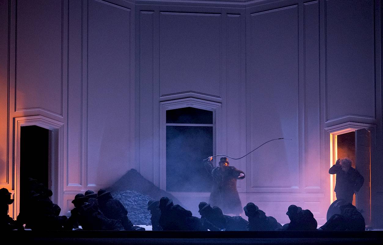 It's spellbinding from the start. The low E flat is played, as Wagner wanted, in total darkness, no lights even on the music stands. And then, as the arpeggios begin, we see, on a slow revolve, not something watery but three identical rooms, white against black. It makes intuitive sense even without Homoki’s explanation, which he reaches by way of the bigger picture: “You have to make up your mind before you even have the image in mind on how you organize the various levels in the piece – the gods, the family of Wotan, and a slightly alien figure of fire; the giants; and the Nibelung. It’s a world without humans, though the gods are a metaphor for human spirit – when a human begins to speak and think, he creates gods, to explain to himself why he is different from nature, and of course he starts to destroy nature quite rapidly and with consequences.” (Pictured below: Christopher Purves's Alberich cracking the whip in Nibelheim).