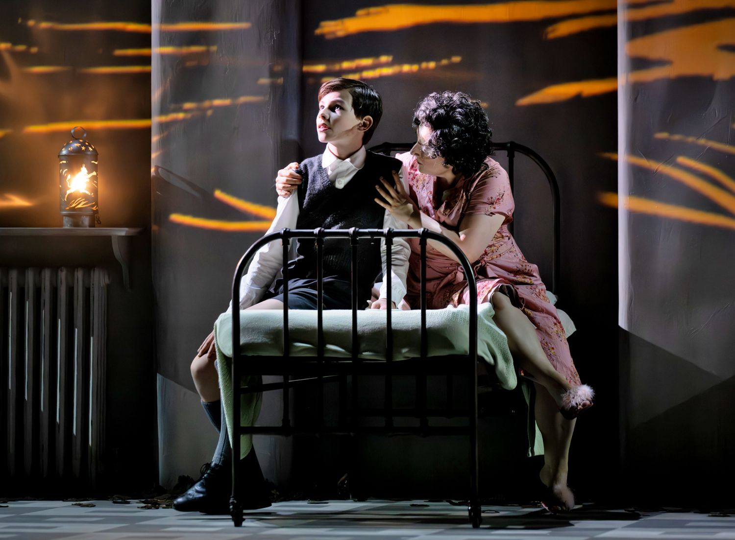 Bywater doesn't overdo it with the kiddy creepiness: the games have subterranean menace only, especially given a sinister large doll, and only once does Miles lash out with a cruel gesture, knocking the medicine cup out of a patient's hand (the past meeting the present). The director/designer's best visual coup, in league with Paul Anderson's adaptable lighting, is to have a rotating motion lamp instead of a candle in Miles' bedroom, projecting illuminated cutouts of devils flying among clouds (pictured above). Jon Driscoll's projection design conjures Bly, its woods and its lake in artistic and atmospheric black and white. So we get the best of both worlds, the 1960s hospital and the country house in the 1930s, with a framework subtly equivalent to James's; this is probably the first Turn of the Screw I've seen with a dramatic equivalent to the past-tense narrative of the novella's Governess. It's all the better for it, a subtle achievement that still applies maximum terror and resonates long after the performance.