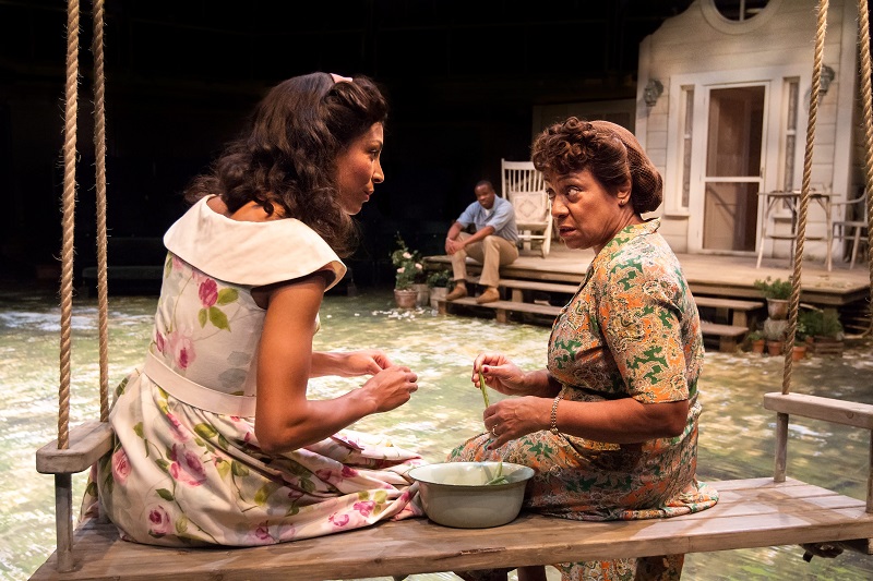 At the centre of it all is Kate, outstandingly portrayed by Croll, the protective wife and mother, hurting, brave, clinging to the hope that Larry is still alive. Despite some eccentricities, particularly of accent (sounding to my ear more Deep South than Midwest), Warrington builds to a venomous climax with powerful effect. Chike Okonkwo finely captures the character of Chris, the affable, sensible, thoroughly decent one who does take on his father in the end. And as Ann Deever, the girl-next-door girlfriend, daughter of the imprisoned patsy and holder till the end of the key piece of information that will stop Kate’s pretence about Larry once and for all, Kemi-Bo Jacobs (pictured above left with Croll) is affecting.