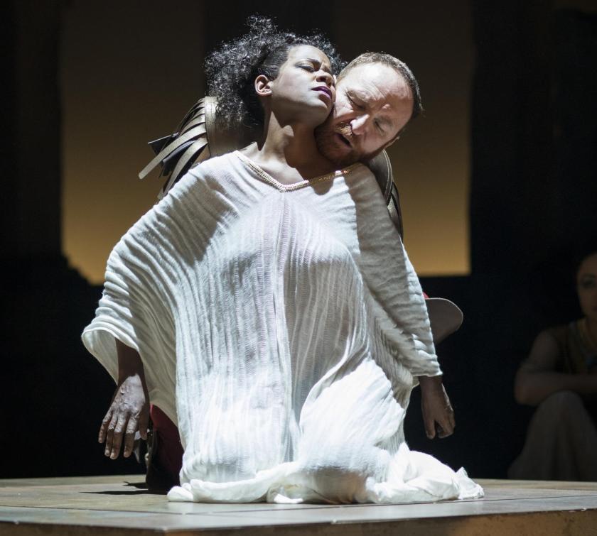 Robert Innes Hopkins’s design excels in that scene, which becomes a kind of celebratory pageant, and also does the lion’s share of defining the different atmospheres of Egypt and Rome. The former is dominated by an enormous ruffled hanging drape, its deep red hue catching the sumptuousness of the exotic South, complete with huge cat figures and lighting from Tim Mitchell that achieves beautiful modulations of gold, the latter, with strict back-stage columns that have a whiff of totalitarianism to them, by its sharpness of space. Then, as the second-half action moves into war, it all transforms, the Egyptian drapery combined with broken plinths of distressed antiquity, a mystery of effect enhanced by back-lighting elements.