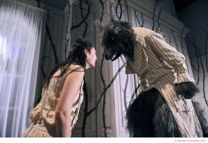 Whatever disapproval they may feel towards the distractions of the subplot, even the most unyielding of purists couldn’t fail to be charmed by Vicki Mortimer’s gorgeous set. A proper French château interior complete with chimney piece, cornicing and French windows (as well as a magical dumb waiter) has its muted monochromes mirrored in the regular patterning of thorny vines that climb the wall, a living cage for the unfortunate Beast (Mark Arends, pictured right with Sian Clifford as Beauty). Beauty’s interest in astronomy prompts a glittering solar system of planets to descend from the ceiling, and there were cries of delight as the final planet – the most remote in the solar system, and home to fairies – emerged above the audience, powdering us all with fairy dust.