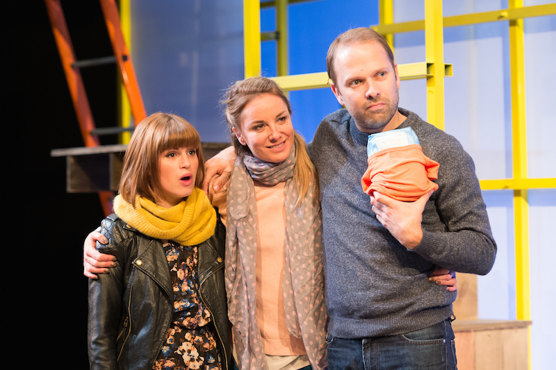 It’s a strange dodge – one of several – in a play that is otherwise admirably forthright about the logistical and emotional process of creating a contemporary family. Andrea (Tamzin Outhwaite, below with Angela Griffin and Nicholas Burns) and Caroline (Griffin) want a child with biological ties to them both, leading them to recruit Andrea’s brother Jimmy (Burns) as sperm donor: Caroline will carry the baby, and it will share genetic history with Andrea. In the spirit of "It takes a village", Andrea invites Jimmy and girlfriend Sharon to move in with them, so that the child will have the support of a loving community – plus live-in babysitters.