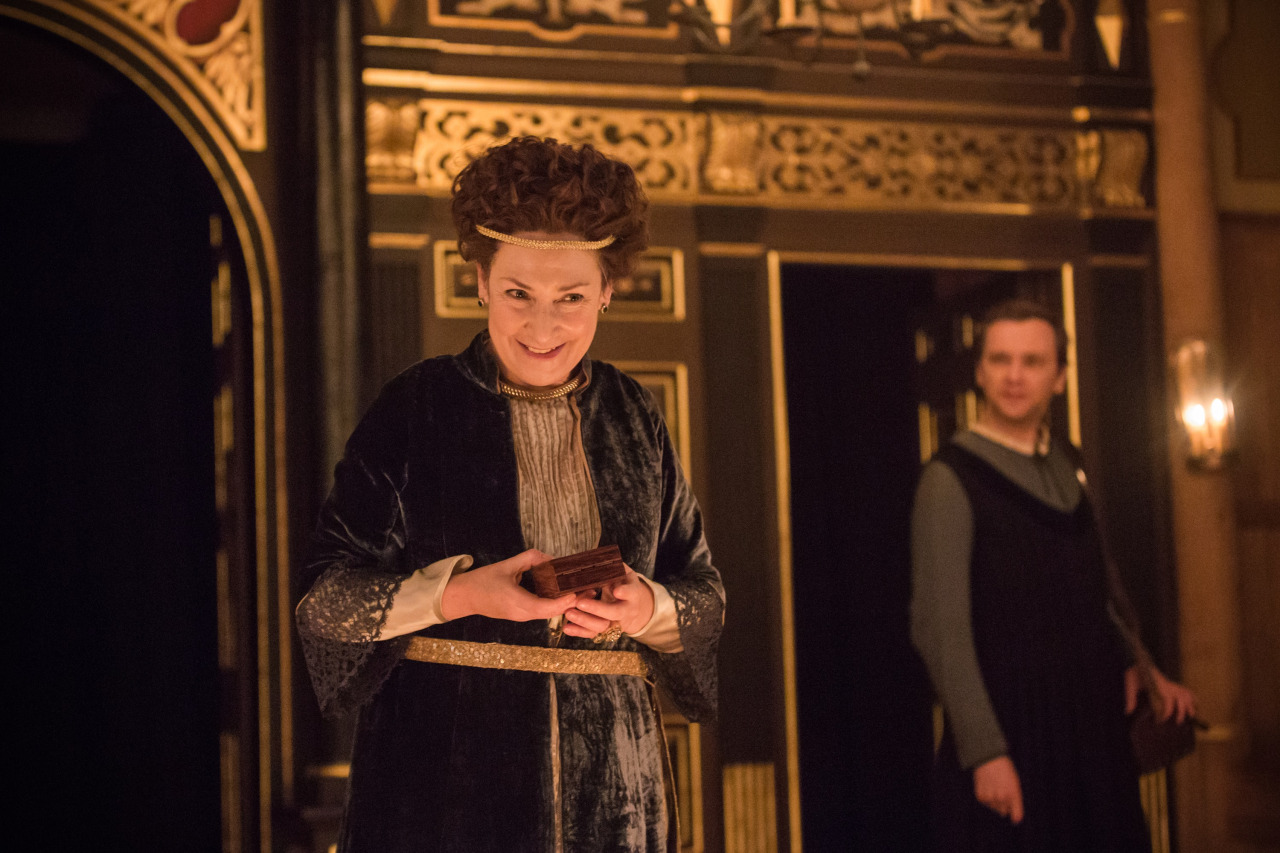 With O’Hare’s Iachimo played as a misguided charmer rather than a Machiavel, and even Callum Callaghan’s Cloten (pictured above with Christopher Logan) more buffoon than outright villain, we’re left casting around for some real villainy here, in Shakespeare’s most violent of tragicomedies. Rape is threatened, voyeuristic assault – Iachimo’s secret visit to Innogen’s chamber – achieved, a head cut off and many killed in battle, yet the stakes here just don’t seem high enough. Innogen’s discovery of the headless corpse is played for laughs, which it successfully gets, but at a high price. Only Pauline McLynn’s Queen (pictured left) dares to be wicked, cackling and scheming as the fairytale script demands.