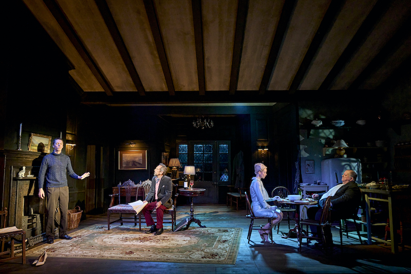 Meanwhile, two other figures have come on stage, which now doubles as the faux cottage across the Atlantic. This time it’s Hedren (Joanna Vanderham) who knocks at the door, to be greeted by Hitchcock (Ian McNeice), these actors perfectly manifesting their physically distinctive real-life characters – he the dramatically rotund, smugly assured veteran director, she the latest, icily beautiful incarnation of a “Hitchcock blonde”.