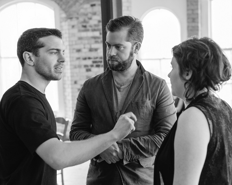 But, often unnoticed, another group of Midsummer characters are playing with similar fire. In Act 1, Scene 2, Peter Quince (carpenter by day and director by night) warns his leading man Nick Bottom against imitating a lion in their upcoming production: "You should do it too terribly. You would fright the duchess and the ladies that they should shriek, and that were enough to hang us all." Quince's trepidation is shared by his mechanicals, and prologues are soon being scribbled down to ensure the wedding guests remain held in the tragical and merry narrative of the play: the Duke and Duchess must hang on their every word, rather than hang them for their every word. (Pictured below: director Simon Evans, centre, with Ludovic Hughes and Melanie Fullbrook)