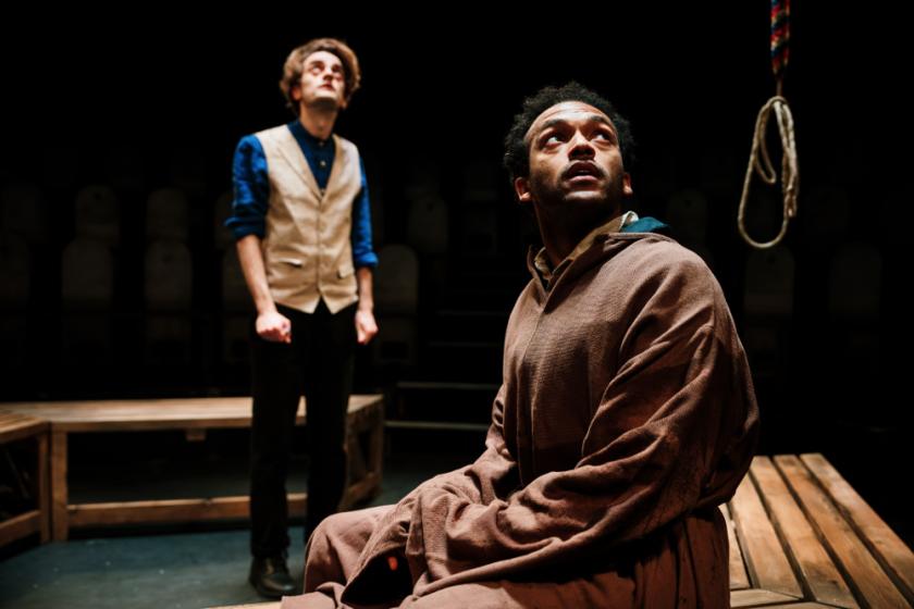 And it’s Hall’s slow but inexorable drip-drip of details that’s one of Bellringers’ key strengths, each nugget of information adding to a picture of a world whose horizons have shrunk, whose population is dwindling, where fungi seem to sprout from all around, where fish rain from the sky, and where desperate superstition has replaced cool-headed knowledge and understanding. It’s all thoroughly plausible but never preachy in the assured pacing of Hall’s gradual exposition, and her vision of an England on the verge of collapse is conveyed very movingly through her two fearful but steadfast young characters. Paul Adefaya’s Aspinall is the more level-headed of the two, and also the one more likely to articulate the bleak realities of their situation in a performance that blends resilience with vulnerability. Luke Rollason’s Clement has a stronger line in nerdy wisecracks, but they cover a neediness and confusion that he only admits in the play’s closing moments.
