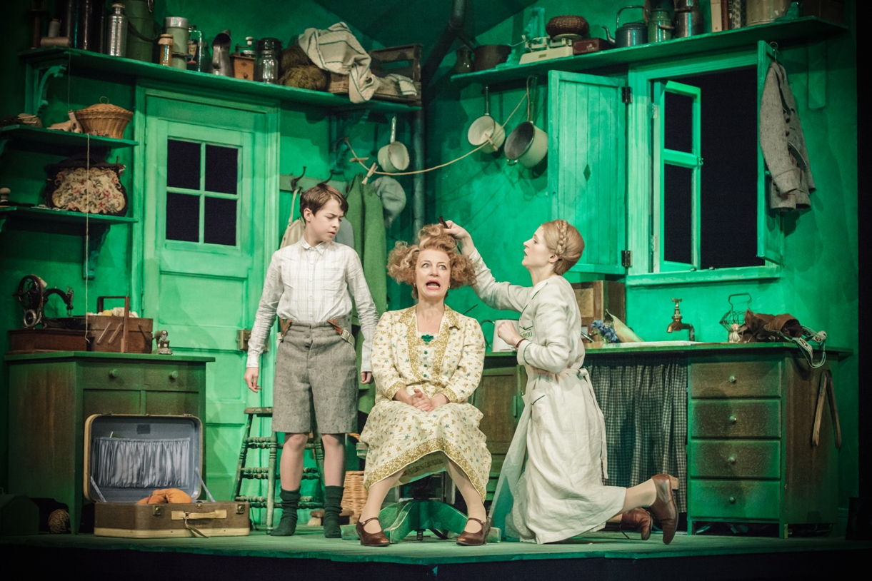 So the sympathy we feel for Naomi Frederick’s Ida in her green kitchen salon at the start (pictured right with one of the three Emils, Daniel Patten, and Tamzin Griffin), the deftness with which Miller weaves in Emil’s dreams of fast cars and guilt about the moustache and red nose he painted on a pompous town statue, the fearfulness of the big city shown by Mrs Wirth (Griffin) who’s having her hair done – in the book she’s far more keen on Emil going to Berlin – all set up the atmosphere.