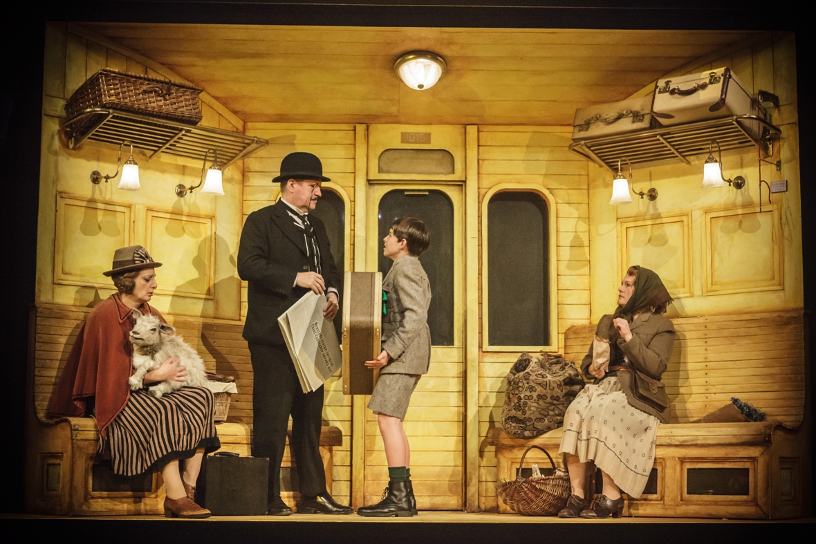 The train journey (pictured below) is strip-cartoon humour without the predatory subtext of the film; bowler-hatted, moustachioed Mr Snow, not the sort of chap a girl would marry, is more a standard comedy villain in the sharp characterization of Stuart McQuarrie, though the deft business where he counts sheep to hypnotize Emil to sleep was a bright idea, the “best bit” of Act One according to the boy sitting behind us.
