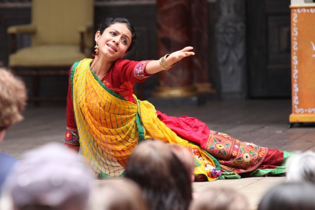 For the troupe's success, credit adaptor Mihir Bhuta and the director Sunil Shanbag, the latter working for the first time in Gujarati (or so I was informed in one of the informal post-show confabs in the Globe's forecourt that have amplified the joys of this season). And honour, as well, the native traditions of the Indian theatre, whose keen embrace of movement and song added enormous weight to the singular quest of the lovesick Helena (known here as Heli) as leading lady Mansi Parekh was able to blossom from a girl to a woman in front of our eyes, a musical soundscape accompanying her every vibrant step of the way. (Three musicians sat to one side, playing harmonium, tabla, and dholak, the last two being the popular Indian hand drums.)