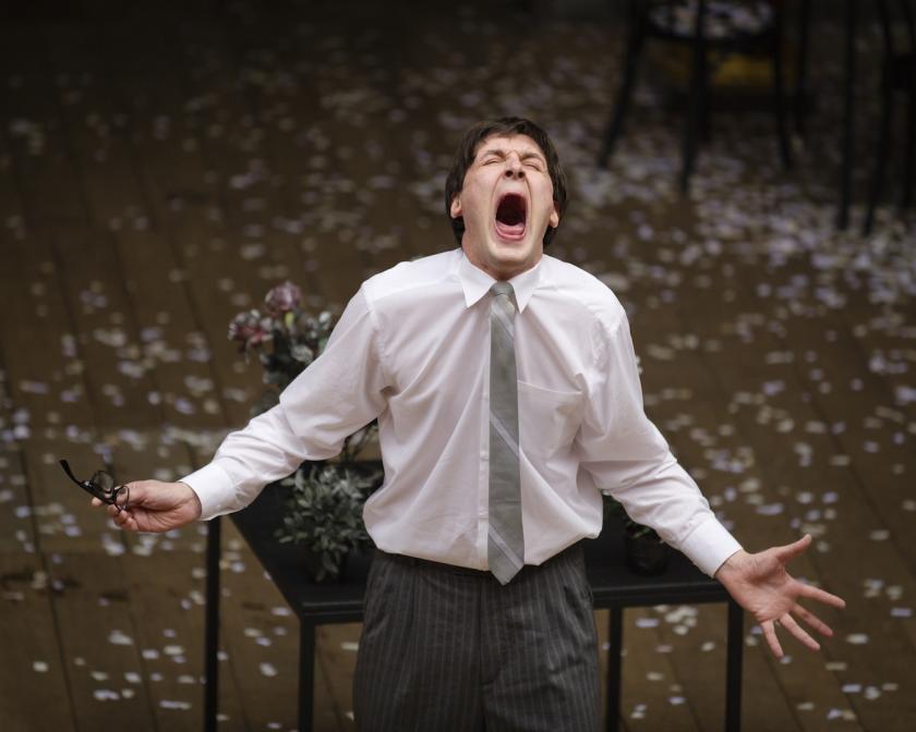 Vakhtangov is also known for the physicality of its performances and there's an awful lot of stage business - mugging, having a member of the audience to hand a prop to the cast, making improv comedy out of a plastic glass being stood on noisily by a groundling. It could be irritating, but when it works, it really does work; we see the moral tightrope Isabella is walking between virtue and loyalty as she carefully treads an imaginary line on stage, and her scenes with both Angelo and later the Duke are choreographed as if in a ballet.