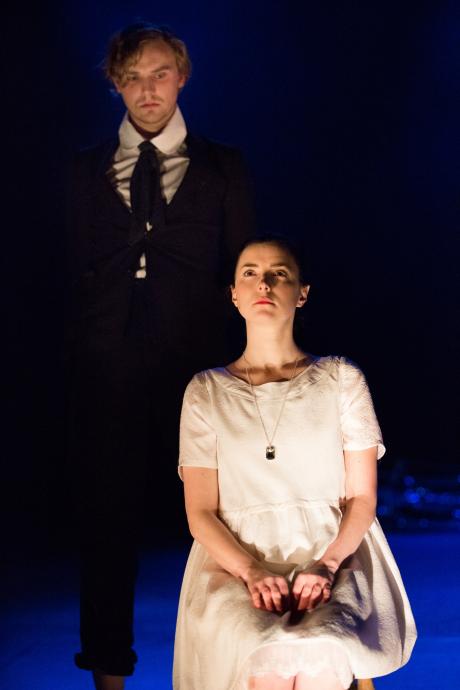 Adjoa Andoh brings to the part of the embittered old lady a spine-chilling reptilian quality: she moves and speaks as if venom were running through her veins. But her monstrosity is tempered at times by an almost reluctant tenderness towards the “boy” Pip. In the first half, Laura Rees (pictured, to the right) plays Estella as a perverse teenager, with a present-day body language that feels oddly anachronistic and yet works. It’s hard at times to see why Pip might fall so hopelessly in love with her, but his masochism is undoubtedly one of the emotional engines of the story. Tom Canton (pictured, to the left) manages pretty well – not least the transition from boy to man, from humble blacksmith’s apprentice to London gentleman – though his stage presence doesn’t always match the power of the other players, not least Tim Potter who moves skillfully from the hard-nosed coldness of Mr Jaggers to the open-hearted generosity of Joe Gargery or Martin Bassindale’s always evocative movement in the parts of Herbert, Compeyson and Mr Wopsle. The pervasive darkness of the tale is relieved by Miltos Yerolemou’s brilliantly comic double act as Mr Bumblechook and Sarah Rocket.