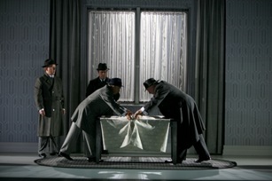 It is, indeed, quiet and undemonstrative, and to that extent a significant change from many of Goebbels’s earlier, noisier shows. Divided into three tableaux, it consists of texts by TS Eliot, Maurice Blanchot and Samuel Beckett (with a short interlude from Franz Kafka) put to a shimmering, a capella score sung by the four male voices of the Hilliard Ensemble.