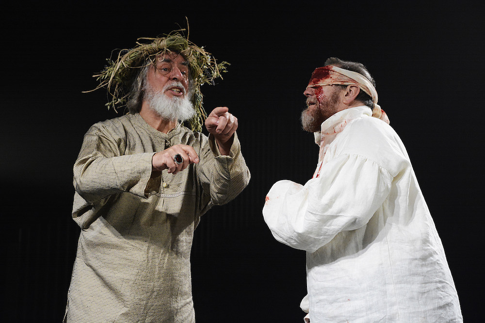 John Branwell’s Gloster is another excellently pitched performance, playing a little fat unpretentious man who automatically obeys when the king commands him, but puffs himself up privately at having begotten two sons (Lear has only the three daughters, of course). Yet Gloster’s idea of fatherhood is as unnourished as Lear’s, and you are left to wonder if it is just a rottenness in nature rather than nurture that turned Edmund bad while Edgar is so good (pictured below left, Rutter and Branwell).