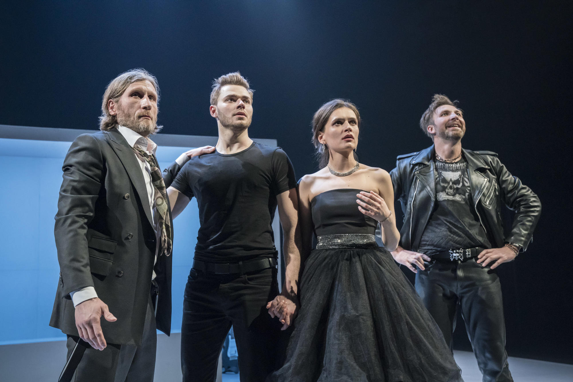 Donellan gives some very contemporary nuance to the two households of that plot, their interaction nicely defined along class lines, the cold aristo formality of the grand Venturewell household set against the rowdy chaos of the Merrythought terraced home. The master of the former takes his hapless would-be son-in-law Humphrey (Andrei Kuzichev) out shooting, while the boozing and Heavy Metal hobbies of the latter’s lord of misrule are what drives his long-suffering wife to flee. (Pictured below, from left, Sergei Miller, Kirill Chernyshenko, Anna Vardevanian, Alexey Rakhmanov)