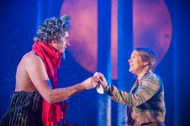 Nonetheless, Ben Onwukwe makes a magnetic, dreadlocked lion, both menacing and affectionate, and the convincingly youthful quartet of children – Cristian Ortega, Claire-Marie Seddon, James Rottger and Charlotte Miranda Smith – are bright and down-to-earth, even if there’s not much of a sense of their transformation from timid wartime evacuees into confident Kings and Queens of this magical land. Pauline Knowles (pictured above, with Cristian Ortega) makes a suitably chilly White Witch, lisping and purring her way through her lines, and Ewan Donald multitasks nicely as fey faun Mr Tumnus (pictured below, with Claire-Marie Sneddon) and fearsome Maugrim, prowling wolf chief of the Witch’s secret police.