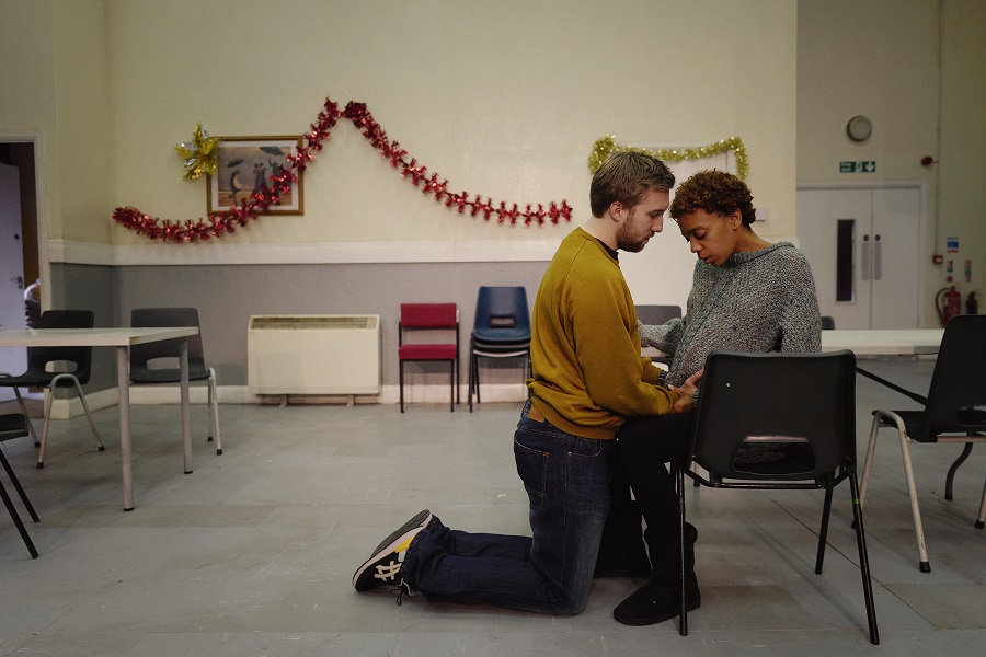 Their neighbours are Emma and Dean, young parents played by Janet Etuk and Luke Clarke (pictured above, both from Beyond Caring, and before that Zeldin’s 2012 NT Studio production, Doing the Idiots); his enduring working relationships with actors isn’t the only thing Zeldin shares with Mike Leigh – both develop stories in close collaboration with their cast. They’re sharing their single room with their young children, slightly stroppy son Jason, who’s already a would-be rapper, and calmer Paige, who finds moments of closeness with Barbara as the play goes on. It’s just weeks before Christmas, and they have a school play to rehearse. More significantly, Emma is heavily pregnant, and they are desperate to be in a new home by the time the baby comes.