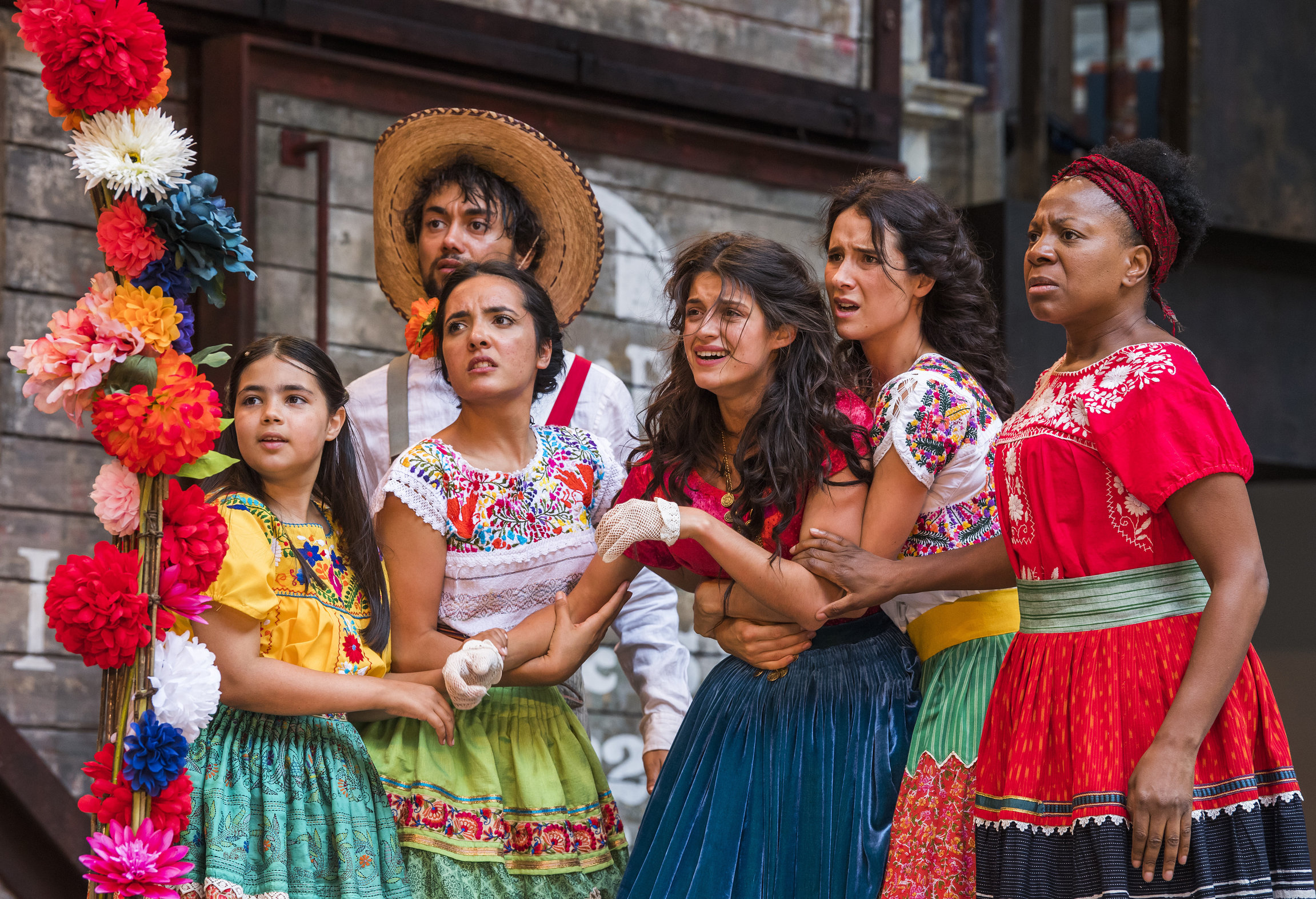 Against the wooden backdrop, dresses in deep reds and blues, acid greens and pinks riot with the colourful slashes of the Mexican flag and the queasy pastels of a shrine to the Virgin Mary. It’s visual joy, conjured from cheap cotton and desperation, and makes sense of the play’s urgent humour, the quick wit and wordplay that distracts from the darker business and the death that is present all around.