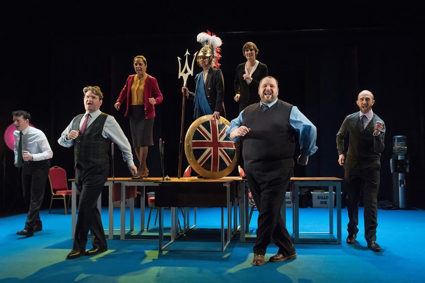 So. Britannia is joined by Caledonia, South-West, Cymru, Northern Ireland, East Midlands and North-East. And while Penny Layden’s Britannia (pictured below with the rest of the cast) gives voice to the politicians with some mildly amusing mimicry, and tells the story of the referendum, the other actors – Stuart McQuarrie, Adam Ewan, Christian Patterson, Cavan Clarke, Seema Bowri and Laura Elfinstone – imitate a host of interviewees, whose opinions come at us in sections devoted to subjects such as Europe, patriotism, hardship and, inevitably, immigration. As you’d expect, the attitudes are predictable: some reasonable, some racist, some frankly stupid. Conflicting emotions of anger, despair and disillusionment (and suspicion of foreigners, who are not given a voice and clearly don’t count as “British”) snake around the text.