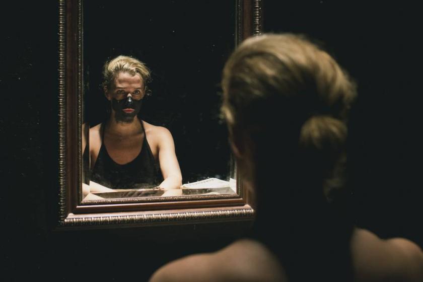 First performed at the Royal Court by Billie Whitelaw in 1973, Not I is a puzzling, maddening flow of words delivered at the "speed of thought" by a disembodied mouth (pictured right). Punctuated by the occasional groan or scream, Dwan flies through the text as if it were music, accenting certain words to form the melody and allowing the rest to merge as harmony. At the end of every section, she declaims the words, "what?… who?… no!… she!…", with a chilling change of pace, before plunging back into the fray. The concept is fascinating – Beckett attempted to create the purest possible form of drama, with his words delivered straight to the audience's ears without action or distraction. Even the title denies any personal input from the performer, who is known in the text merely as "mouth". Fittingly, the final effect is more than a little discomforting to experience, and extremely uncomfortable for the actor to perform, requiring thick tar-like face make-up and straps to hold the head and body rigid above the stage.