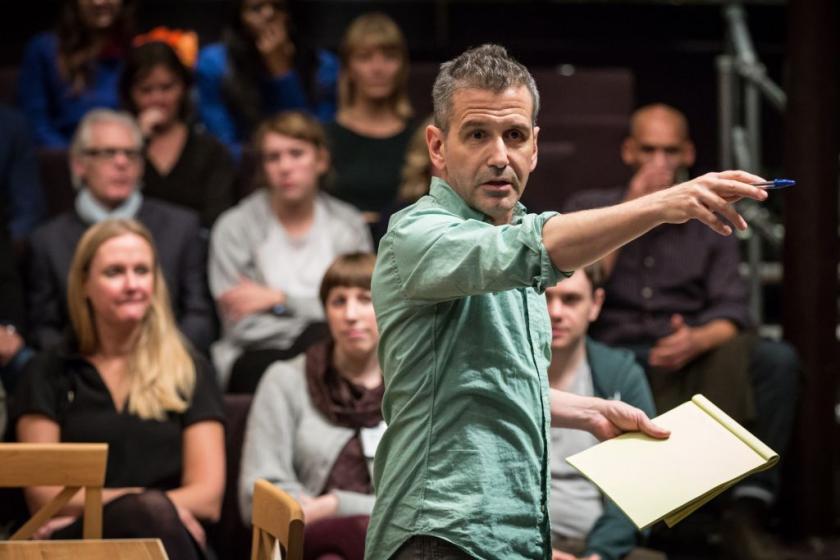Presiding over events is the Stage Manager as played by Cromer himself, the character functioning as educator, editor and author of events all in one. (When he's had enough of a particular moment, he interrupts it.) Entering the playing space in street clothes, clutching a notepad and mobile phone, Cromer resembles nothing so much as a theatre director giving notes to his cast, and his crisply direct delivery projects something of the no-nonsense authority of that teacher who made you sit up and pay attention and maybe even enjoy school.