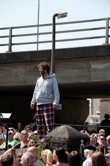 But a bit of roughness round the edges was to be expected, even celebrated. Sheers’s task was to offer easy narrative sight lines for those joining at any time while also delivering a story of symbolic power. Now and then it veered right off the known path, spiriting up a highly apocryphal long lost daughter for the Teacher. Meanwhile, in the interests of directness, the villains of the piece were drawn a little too gauchely. But as the Trial on Sunday afternoon made way for the Procession, the strands of this hugely ambitious project started to take on a kind of unstoppable tidal power.
