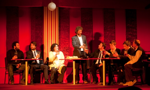 The production was full of beautifully accurate tableaux familiar from the Renaissance masters – the Last Supper (pictured below, photograph by Rich Hardcastle), disciples sleeping through the Agony in the Garden. But with religion being swept under the carpet even as the story clung faithfully to the iconography of the Gospels, at times you wondered whether The Passion of Port Talbot risked making a mockery of itself. Why were they ripping those sandwiches in half at the Supper if not to evoke the Eucharist? How were they going to get a partisan crowd, playing their part to the hilt, to condemn a local hero to execution? (Simple: rather than ask everyone to choose, ask a willing young girl instead). The actor playing the Father as some kind of celestial roofer at the Garden of Gethsemane (David Davies) didn’t help matters by forgetting his lines at the moment the play worked to conjure up its own lay justification for the supreme sacrifice.