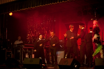 By Saturday evening, the Teacher had gathered about him a group of followers and headed to the Seaside Social and Labour Club for the last night of revelry before impending closure. As they sat at tables, shared sandwiches and toasted their new friendship – their oneness – with lager, an MC teed up entertainers who turned out to include Britain’s Got Talent’s popular tenor Paul Potts and the so-called house band, the Manic Street Preachers singing new, dramatically apposite words to iconic tunes. That no one was to be spared participation in this drama was freshly underlined when the Manics were manhandled by police cadets in berets and thrown out (pictured above, photograph by Rich Hardcastle). They couldn't quite suppress a guffaw or two.