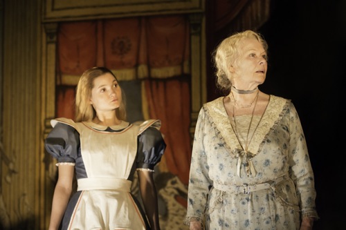 As the pair’s memories resurface and their young alter egos reassert themselves, Christopher Oram’s masterly set opens up like a marvellous toybox, disgorging layer after layer of storybook wonders. The drab storeroom flies away, revealing a giant toy theatre decorated with Tenniel-inspired illustrations. The Mad Hatter and the Red Queen perch in boxes; the Cheshire Cat grins from atop the proscenium. Here, Wonderland Alice in her blue frock and apron (Ruby Bentall, pictured above with Dench) and puckish Peter Pan (Olly Alexander) offer their wicked and unsparing, child’s-eye verdicts on the grown-ups Liddell and Llewelyn Davies have become.