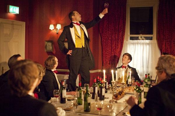 Set in a faux-Regency room somewhere outside Oxford, beautifully evoked in Anthony Ward’s colourful and claustrophobic design, the play introduces us to 10 young men, members of an elite undergraduate dining club, who believe that they have a right to rule. The play shows how an evening of harmless fun — spiced up with misogynist comments, hearty hurray swearing and some disillusioned drivel about the modern world — turns into a really ugly incident, which will haunt these boys forever.