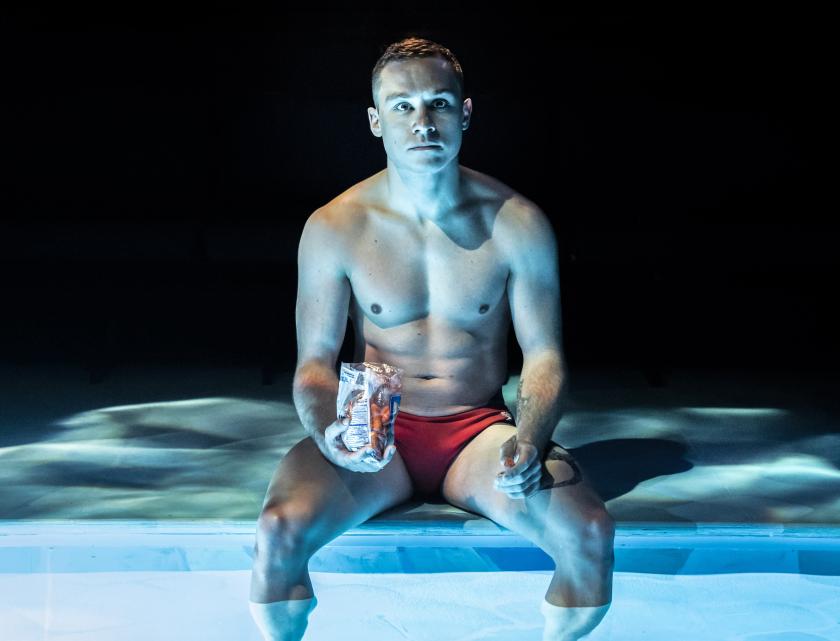 It’s an ambitious staging. There, sunk into the little theatre’s playing space, is a mini-pool full of water, its bright red cover removed once the audience is in place. Anna Fleischle’s design also extends out to the walls of the stalls, which are painted in a Hockneyesque shorthand for blue swimming-pool water. Ray (Finn Cole) will spend a large part of the piece sitting on the side of the pool in a pair of red trunks, sporting a giant tattoo of a snake and nibbling what I took for a popular US brand of cheese snacks but which turned out to be baby carrots.