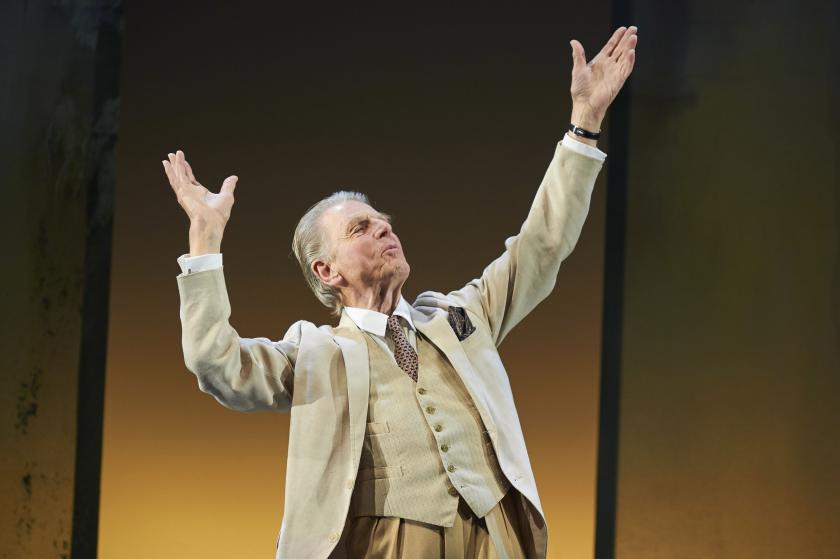 Set and costume are simple and impressionistic: this is a show about speech and imagery. Fox wears a young beau’s linen in the first act, and an architecture critic's grey suit in the second. Otherwise, the bench Fox sits on is probably (since he’s drinking Mâcon-Villages throughout) in his garden, but it could be in a churchyard, or one of the parks of Metroland, and the leaves with which the stage is strewn evoke the sense of good times fading that pervades both the poet’s own life and the England he depicts.