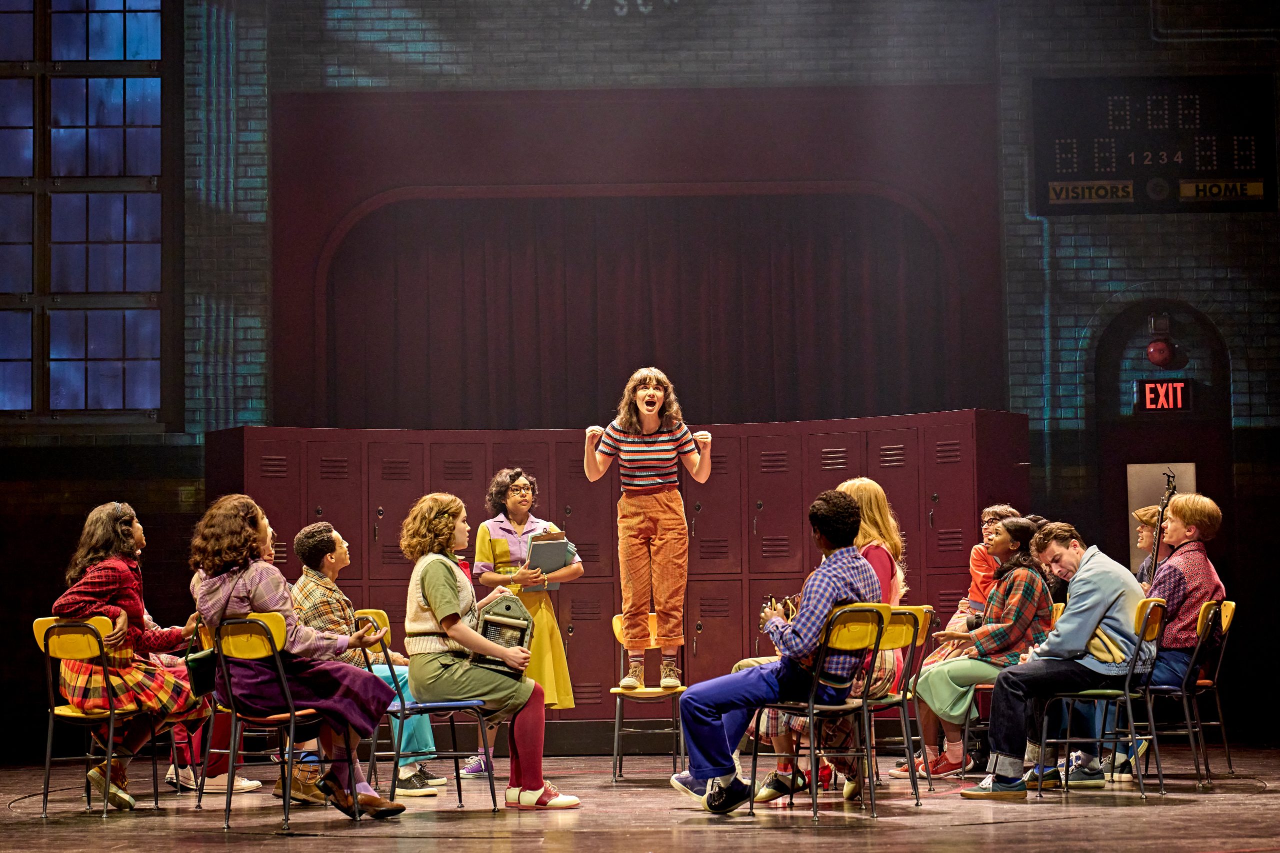 Miriam Buether’s immensely agile and airy set design relies on a central revolve and sliding panels to evoke a wide array of settings with minimal fuss and maximal effect. Whether we are in the realistically rendered hallways of Hawkins High (pictured below) or in the watery realms of Henry’s mind, the effect is one of irresistible immersion. John Clark’s incisive lighting – alternating between ambient power and neon-only emphasis – is indispensable to the production’s visual character, whose sustained fluidity is a supreme achievement to behold. Resonant, action-tinged sound effects (designed by Paul Arditti) plunge us further into a filmic environment whose distinctly theatrical realization before our eyes adds to its special charm.Stephen Daldry, joined by his co-director Justin Martin, orchestrates this massive undertaking with sharp momentum. Even though Trefry’s script feels a touch schematic and diffuse at times, the direction succeeds in presenting a punchy, stimulating whole that helps the production earn its three-hour runtime. Coral Messam’s choreography and Lynne Page’s movement direction, especially foregrounded in a musical dream sequence and during the high schoolers’ own play, help propel the action with captivating force. A piece of this nature and length would likely benefit from a more emphatic, spectacular climax, but a chilling final scene memorably solidifies the link between this tale and the subsequent matter of the TV series.